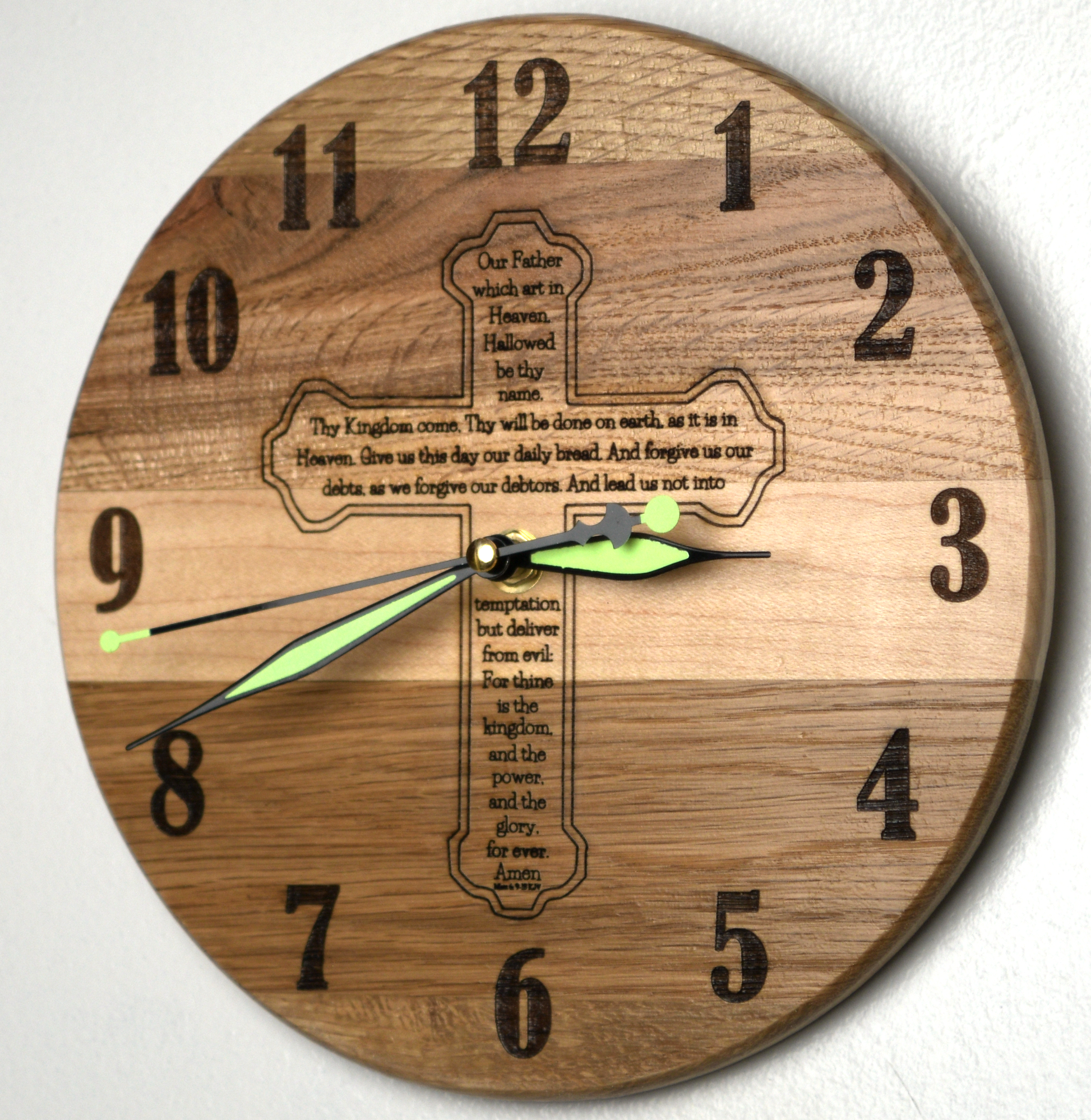 This distinctive Lord's Prayer Clock features the sacred prayer intricately inscribed within a crucifix design, creating a powerful fusion of faith and function. Constructed from premium solid wood in your choice of warm oak and black walnut, each clock demonstrates superior craftsmanship and attention to detail. The cross-centered layout transforms the timepiece into a meaningful spiritual focal point for any room. An exceptional gift for new homeowners or newlyweds, this heirloom piece honors important life transitions while serving as a daily reminder of faith and devotion.